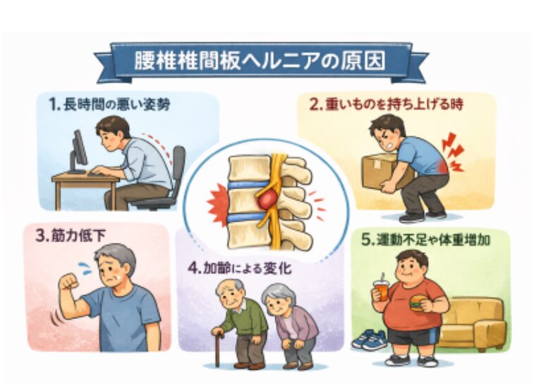 腰椎椎間板ヘルニアは、ひとつの原因だけで起こるわけではなく、日常生活の積み重ねによって発症するケースがほとんどです。